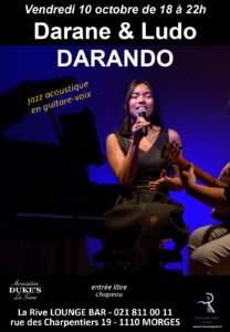 Darane chante. Ludo chante et joue la guitare.La soirée musicale se déroulera au La Rive Lounge bar à Morges en deux parties : la première entre 18 et 19 heures pendant l’apéro et la seconde entre 20h15 et 22 heures pour la soirée.L’entrée est libre et un chapeau passera pour les musiciens.La réservation est recommandée au numéro 021 811 00 11 en précisant que vous venez pour le concert afin de vous placer au mieux.