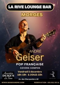 La soirée musicale se déroulera au La Rive Lounge bar à Morges et en deux parties : la première entre 18 et 19h pendant l’apéro et la seconde entre 20h15 et 22 heures pour la soirée.