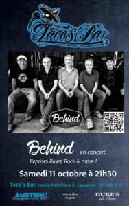 BEHIND est un groupe lausannois de reprises de musique Rock et Blues, dont BB King, Eric Clapton, Rolling Stones, The Kinks, The Animals, John Mayer, Dr. Feelgood, Nirvana, Green Day, Sex Pistols, ZZ Top, …