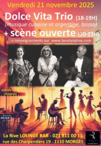 C’est une soirée un peu différente que d’habitude que nous vous proposons dans une ambiance musicale d’Amérique latine avec un concert de 18 à 19h par le trio Dolce Vita Trio dans un répertoire de musique cubaine et argentine et de bossa