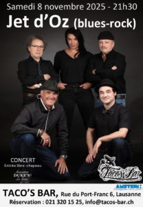 Jet d’Oz est un groupe genevois de blues-rock et ballades jazzy dont le répertoire va de Muddy Waters à Nina Simone en passant pas Tina Turner. Il se compose d’une chanteuse venant du gospel, d’un pianiste affectionnant notamment le vieux jazz, d’un guitariste de blues, d’un bassiste de rock et d’un batteur polyvalent. JDBB s’est produit, entre autres, à la Guinguette, au BAG et au Pick-Wick.