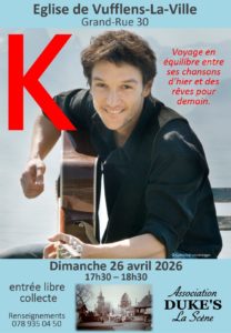 Le concert se tiendra à l’Eglise de Vufflens-la-Ville de 17h30 à 18h30, le dimanche 26 avril 2026. L’entrée est libre et une collecte sera organisée pour le musicien.