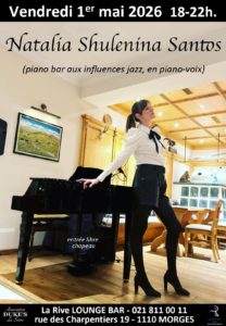 Natalia Shulenina Santos, pianiste et chanteuse, revisite des chansons connues dans un style piano bar aux influences jazz. Son univers musical multilingue apporte une touche élégante et chic”.