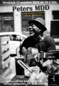 Originaire du Benin et vaudois depuis plus de 20 ans, Peters MDD nous fera voyager autour du monde dans un répertoire extrêmement varié de reprises incluant aussi des grandes chansons françaises, et quelques compositions propres.