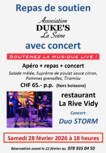 Soutenez notre association en passant une belle soirée entre mélomanes et passionnés de musique live, en participant à notre repas de soutien qui se tiendra le samedi 28 février au restaurant La Rive Vidy (Lausanne). L’apéro sera servi à 18 heures.