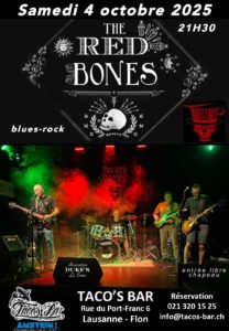 The Red Bones est un groupe blues-rock suisse jouant des reprises et ses propres morceaux. Depuis sa formation en 2016, il se produit régulièrement dans des festivals, des bars, des Open Air et des événements privés. Le groupe est basé dans la région lausannoise. Il est composé de 4 musiciens: un chanteur-guitariste, un guitariste, un bassiste et un batteur.