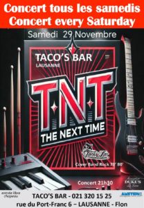 Samedi 29 novembre à 21.30 au TACO’S Bar à Lausanne. Venez nombreux, ça va être sympa !!!