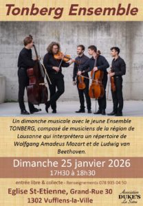 C’est l’objectif du TONBERG Ensemble composé de jeunes musiciens professionnels issus de la Haute Ecole de Musique de Lausanne (HEMU). Ce dimanche 23 janvier, ils nous proposent durant une heure un répertoire de Wolfgang Amadeus Mozart et de Ludwig van Beethoven.