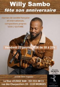 La soirée musicale de Willy se déroulera au La Rive Lounge bar à Morges et en deux parties : la première entre 18 et 19 heures pendant l’apéro et la seconde entre 20h15 et 22 heures pour la soirée.