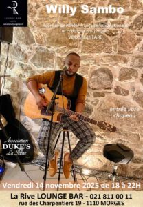 La soirée musicale de Willy se déroulera au La Rive Lounge bar à Morges et en deux parties : la première entre 18 et 19 heures pendant l’apéro et la seconde entre 20h15 et 22 heures pour la soirée.